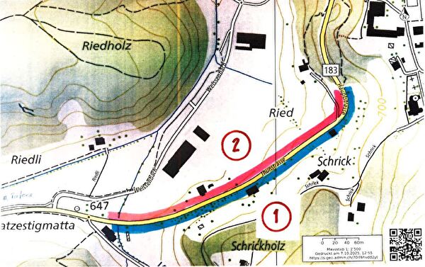Der Verkehr auf der Kantonsstrasse wird beim betroffenen Teilstück "Schrick" für den Durchgangsverkehr und für die betroffenen Anwohner wie folgt geregelt: